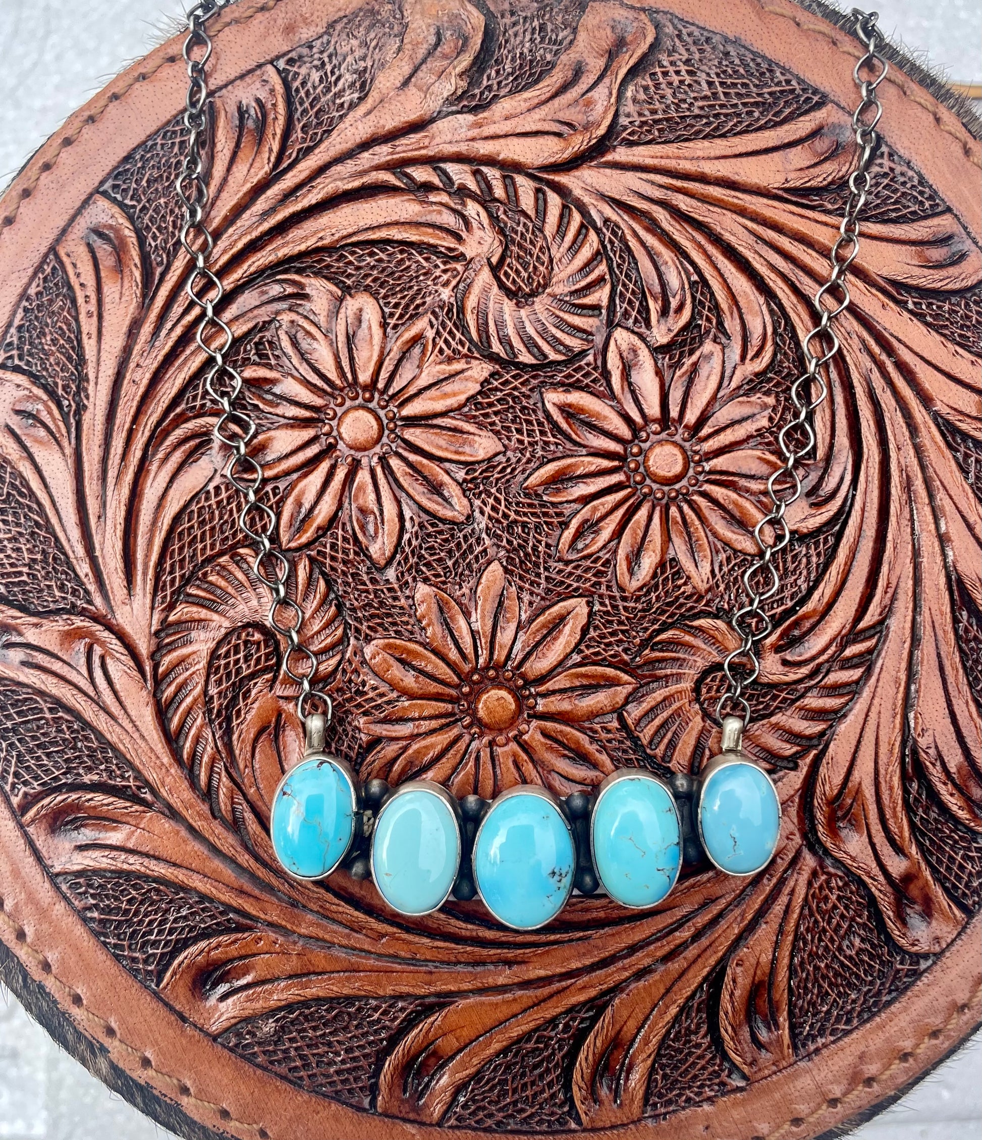 Enhance your wardrobe with the Loretta, a 20-inch necklace featuring Golden Hills stones. This beautifully handcrafted necklace by Navajo artist Antionette Mart embodies authentic Navajo artistry, combining rich cultural tradition with graceful design.