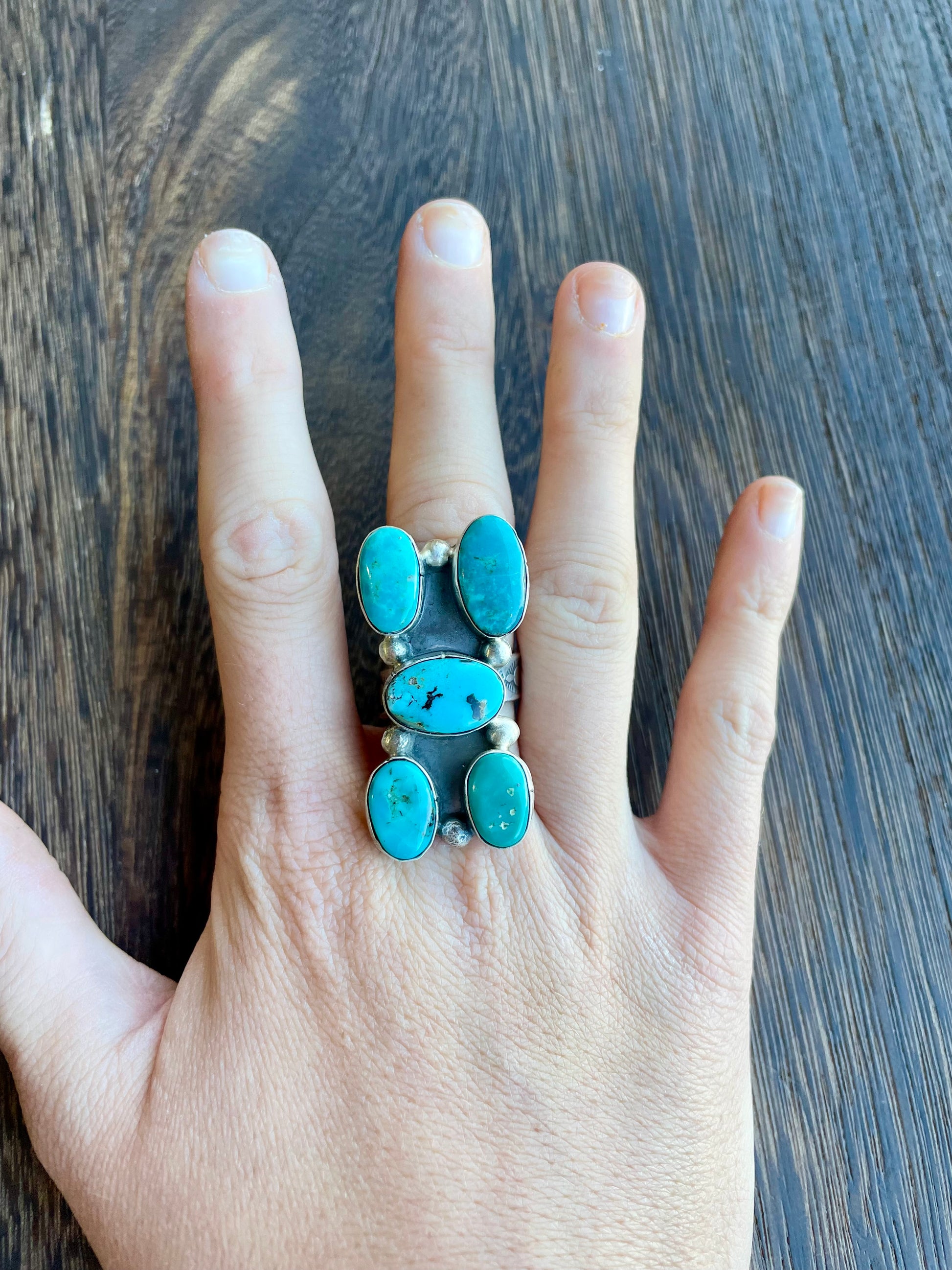 Get ready to turn heads with The Riley! This playful, adjustable ring is handcrafted by Native artisans, stamped PN and features five stunning turquoise stones that add a splash of color to any look.