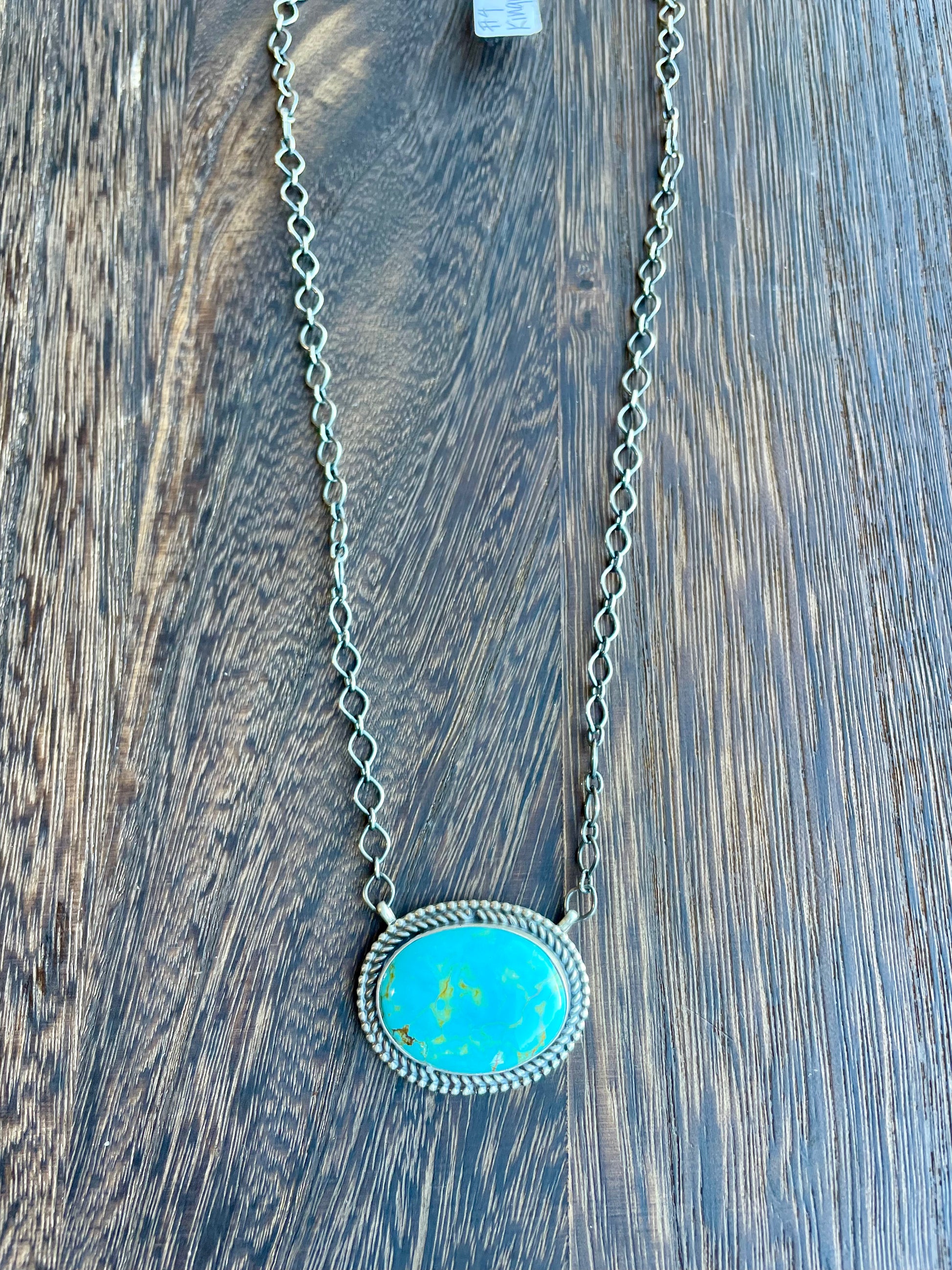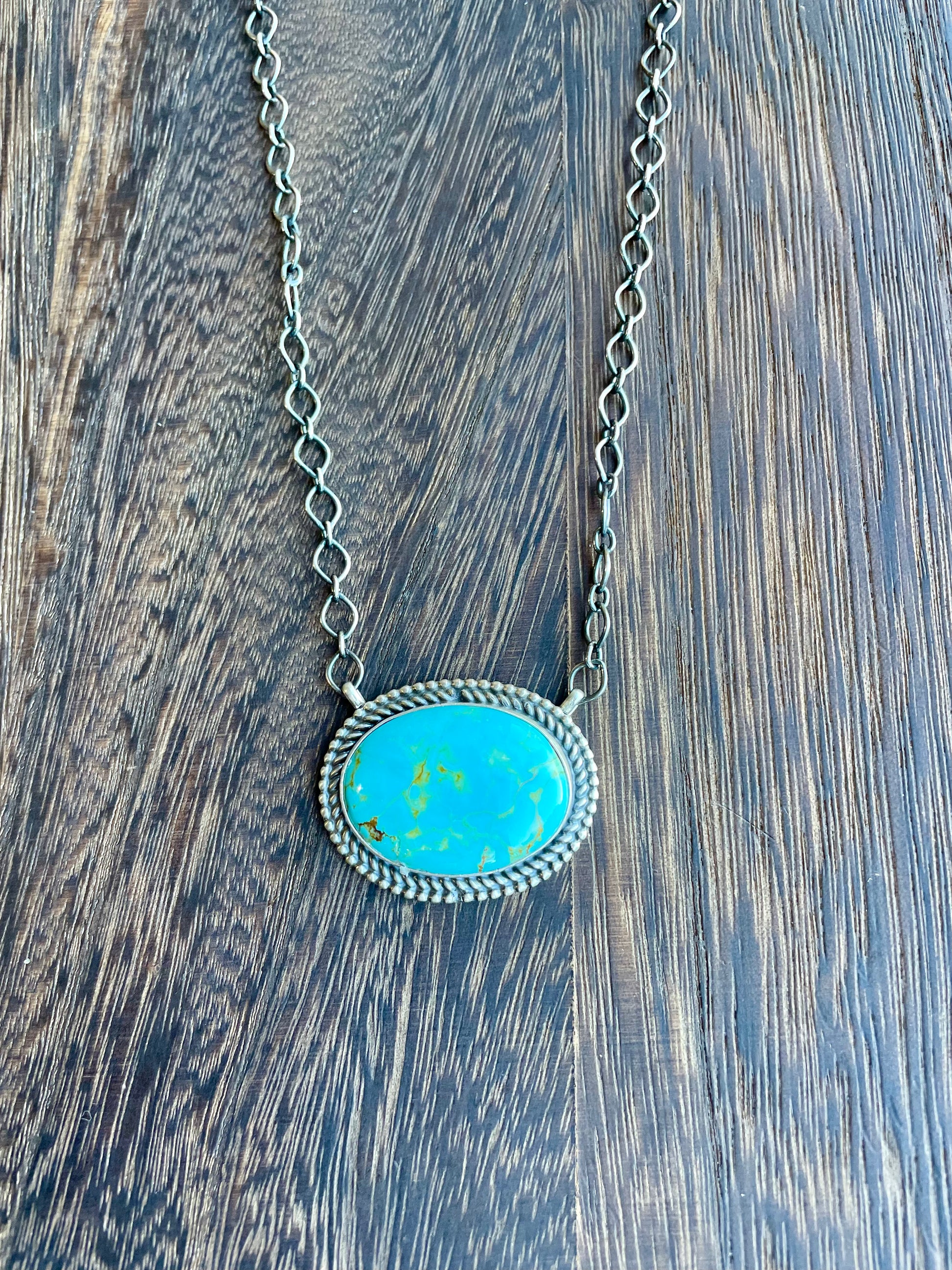 Make a bold statement with "The Patsy," a daring 20-inch necklace featuring a large Kingman stone handcrafted by Navajo artist, Antionette Martinez.