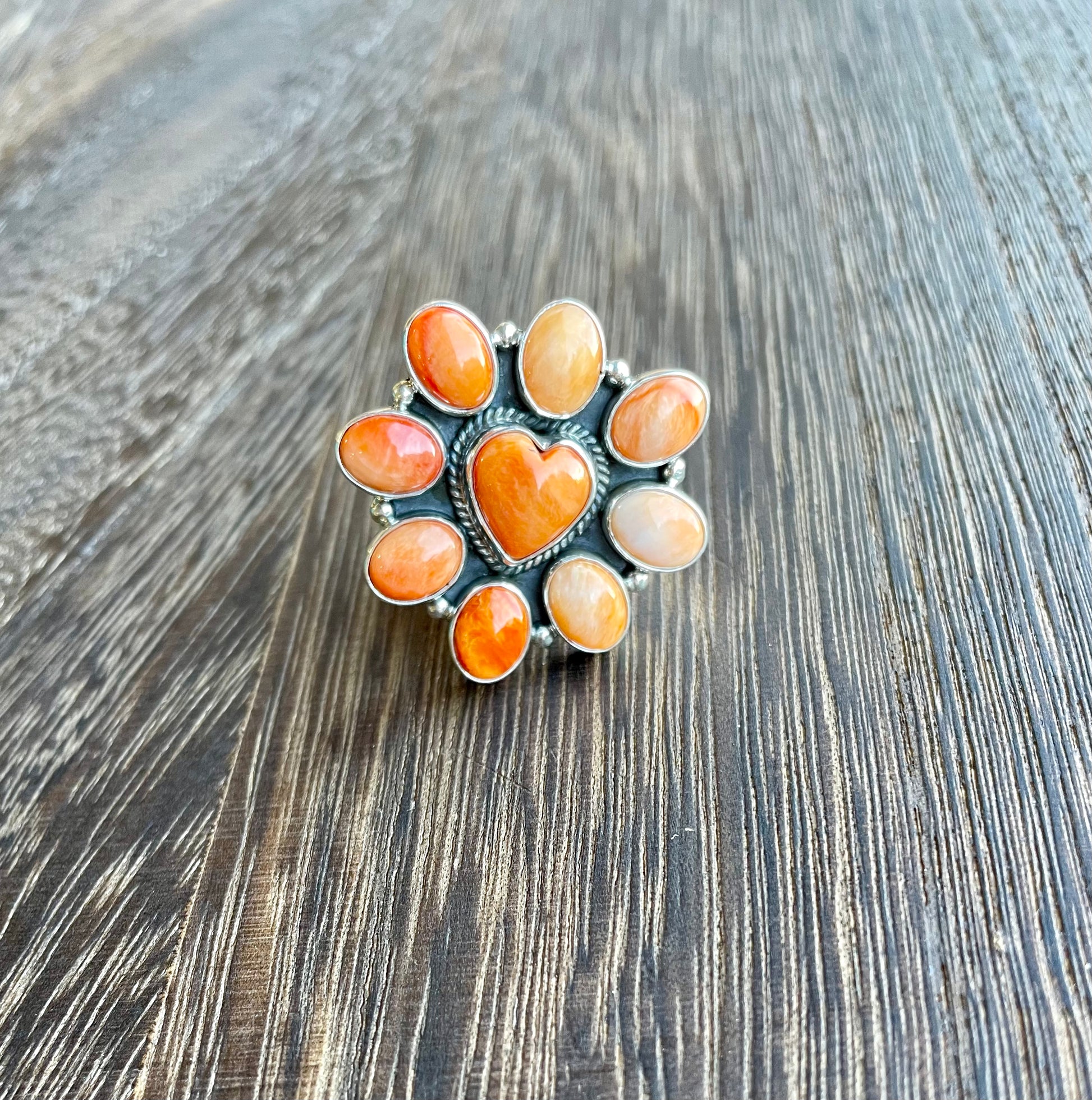 The Betty Ring showcases a charming heart-shaped design highlighted by warm, vibrant spiny oyster stones.