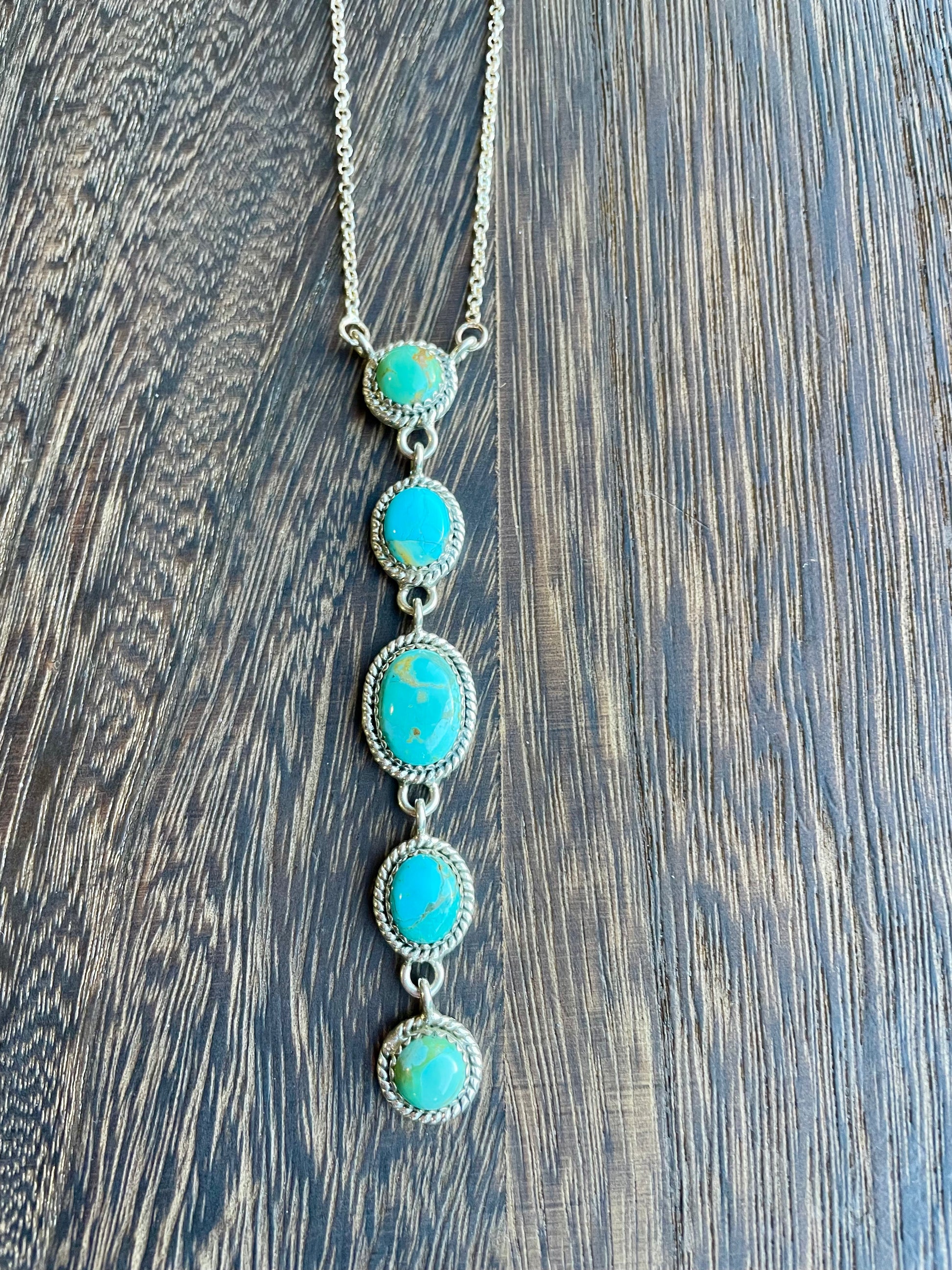 Make a bold statement with The Reba Lariat, featuring five vibrant Kingman Turquoise stones set along a 20-inch chain. This daring design brings a powerful touch of Southwestern spirit and vibrant color, perfect for those who aren’t afraid to stand out.